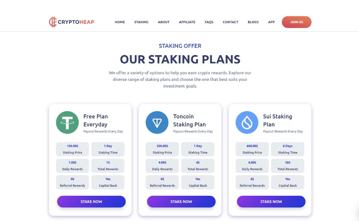CryptoHeap’s platform has several staking plans that are suited to various investment goals. They include the Free Plan, Toncoin Staking Plan, Sui Staking Plan, Polygon Staking Plan, Cardano Staking Plan, and Ethereum Staking Plan. Every plan is characterized by different stake prices, durations as well as daily reward rates enabling investor flexibility when choosing one that suits their financial aims and tolerance for risk.